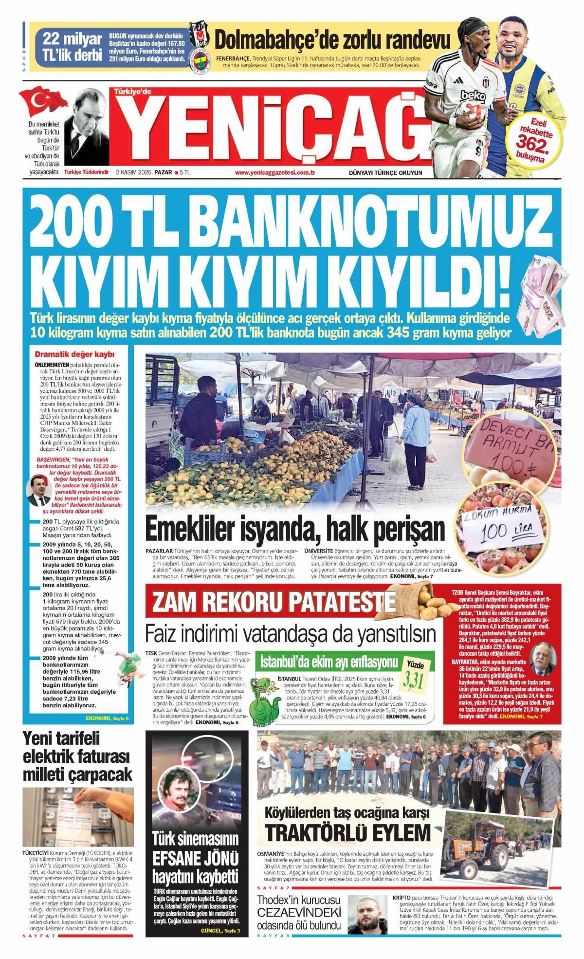Yeni Çağ Gazetesi 2 Kasım 2025 Günü Gazete Manşetleri